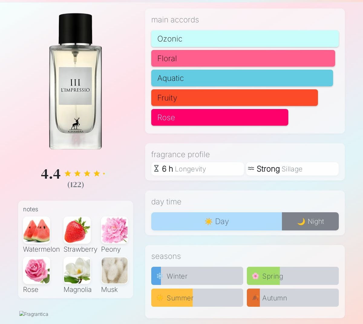 Découvrez L’Impressio, une fragrance fraîche et élégante inspirée du célèbre L'Imperatrice. Ce parfum révèle un mélange lumineux de fruits rouges juteux et de notes florales délicates qui apportent une sensation de fraîcheur et de féminité. Son cœur doux et raffiné évolue vers une base légère et musquée qui laisse un sillage propre, séduisant et très agréable. Un parfum parfait pour celles qui aiment les fragrances fraîches, modernes et faciles à porter au quotidien.
